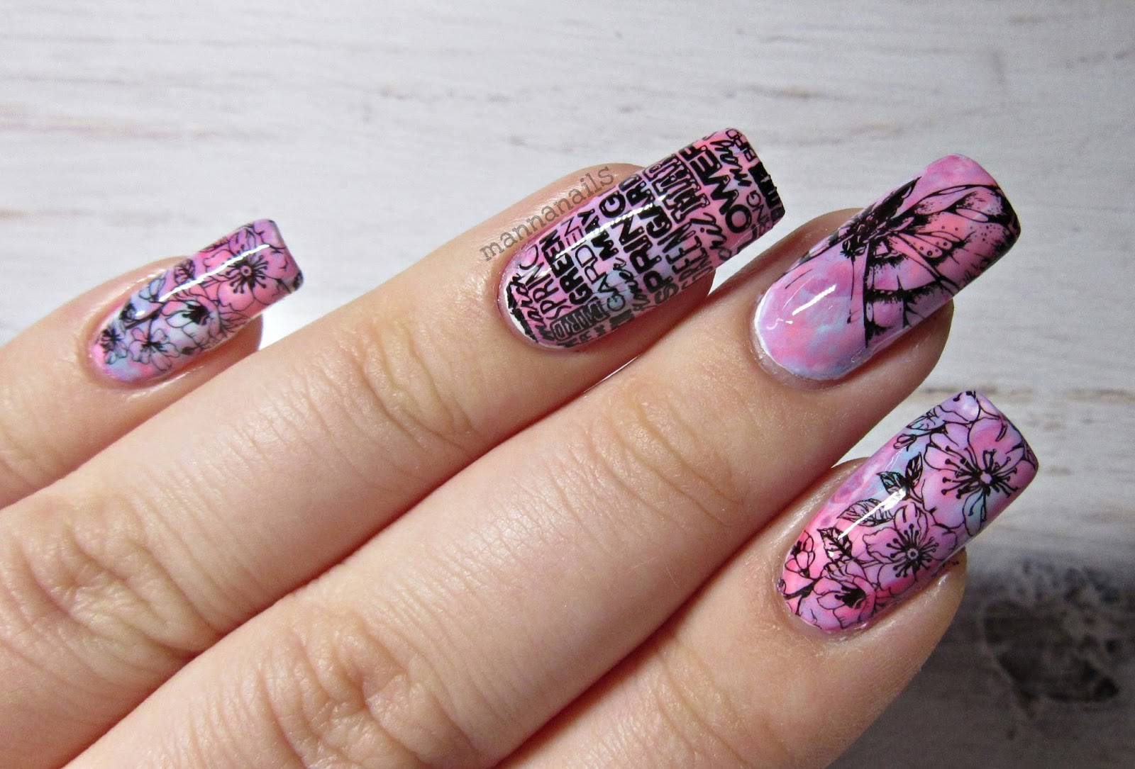 Sokat gondolkoztam, végül egy pinkes, lilás, kékes smooshy alapot készítettem, amire csupa tavaszi dolgot, pilangót, virágokat és egy tavaszi feliratot nyomdáztam a Moyra Primavera és L'Amour lemezéről.